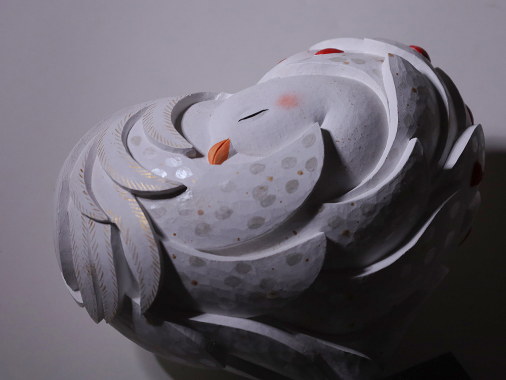 鑿が入った痕も、木の流れに沿うように残されている。素材が語りかけてくる瞬間に、彫りは止まる。木の声に耳を澄ませるように、形が生まれる。